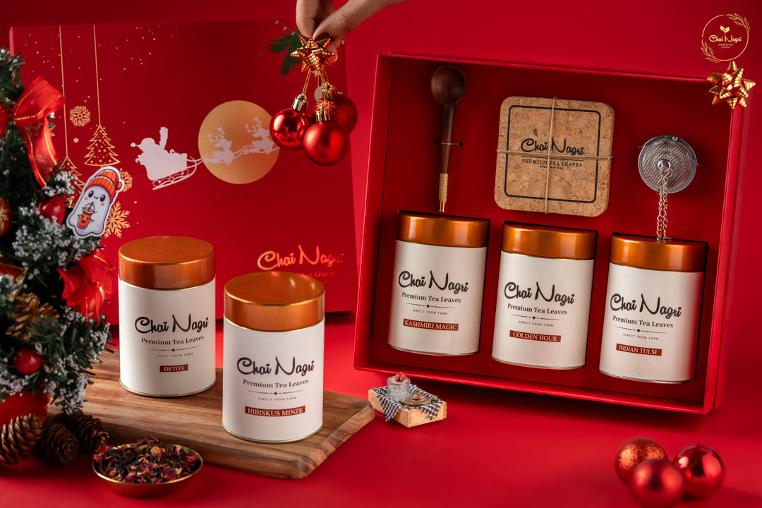Chai Nagri Weihnachts-Tee Geschenkbox – 3 Premium-Tees deiner Wahl + edles Zubehör